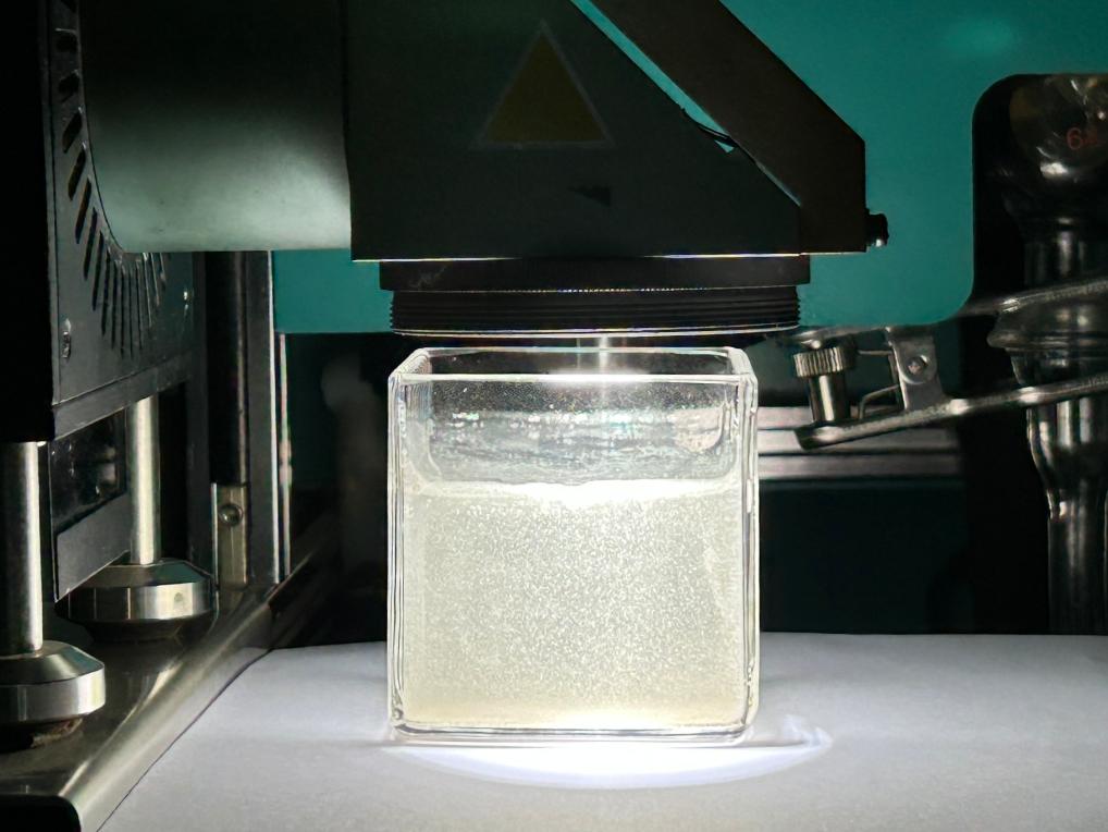 在模擬太陽光下,科研人員利用改造后的二氧化鈦催化材料分解水制氫。新華社記者 劉禎 攝